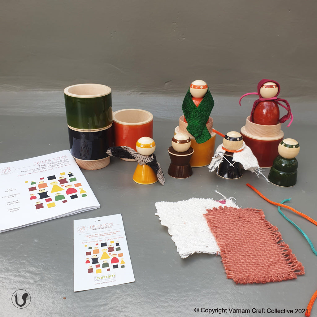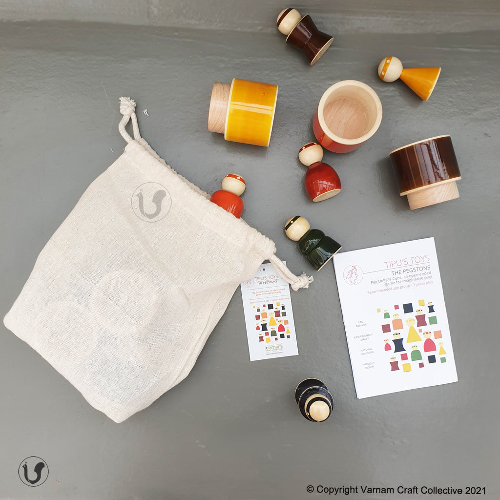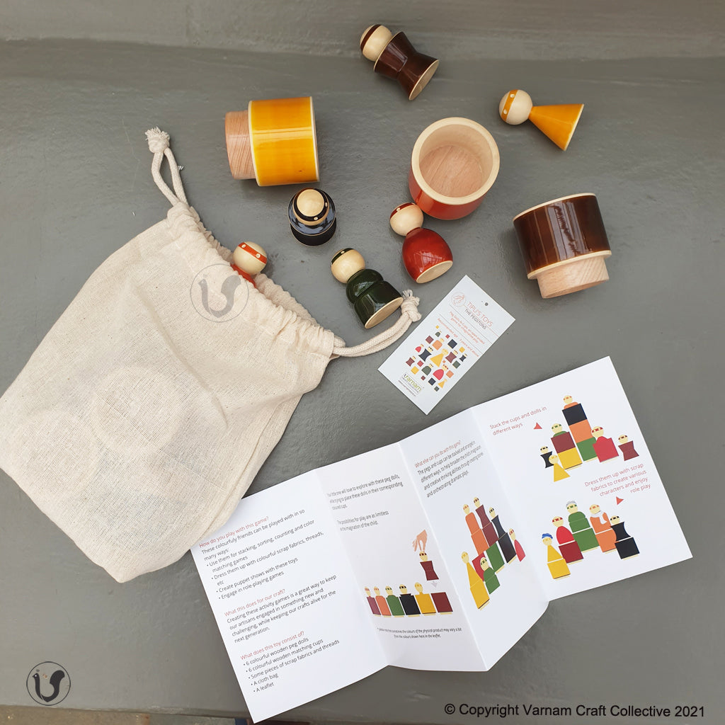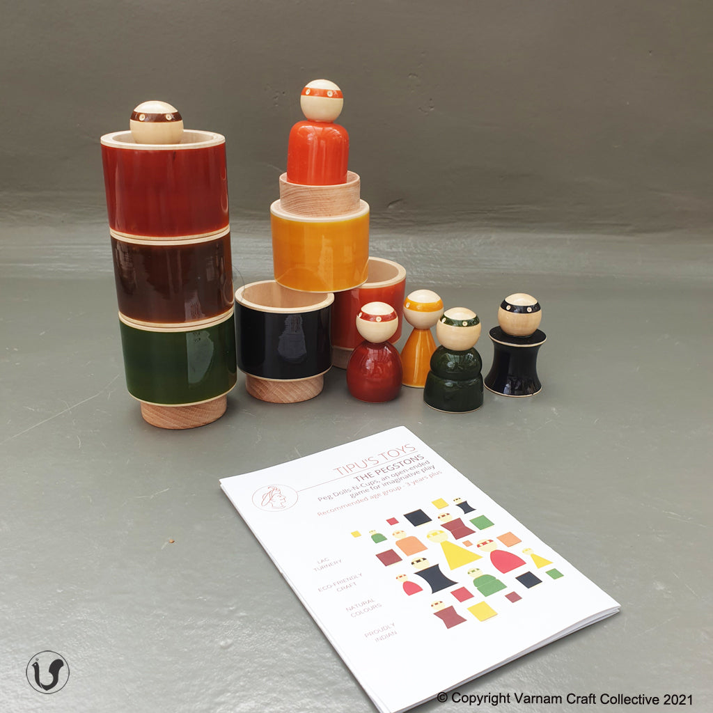 - 6 colourful wooden peg dolls and matching cups.