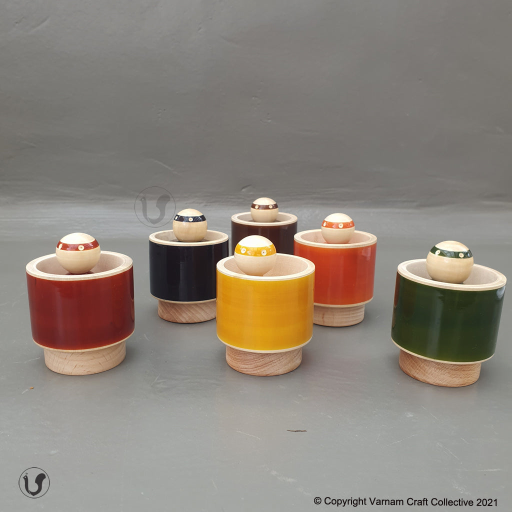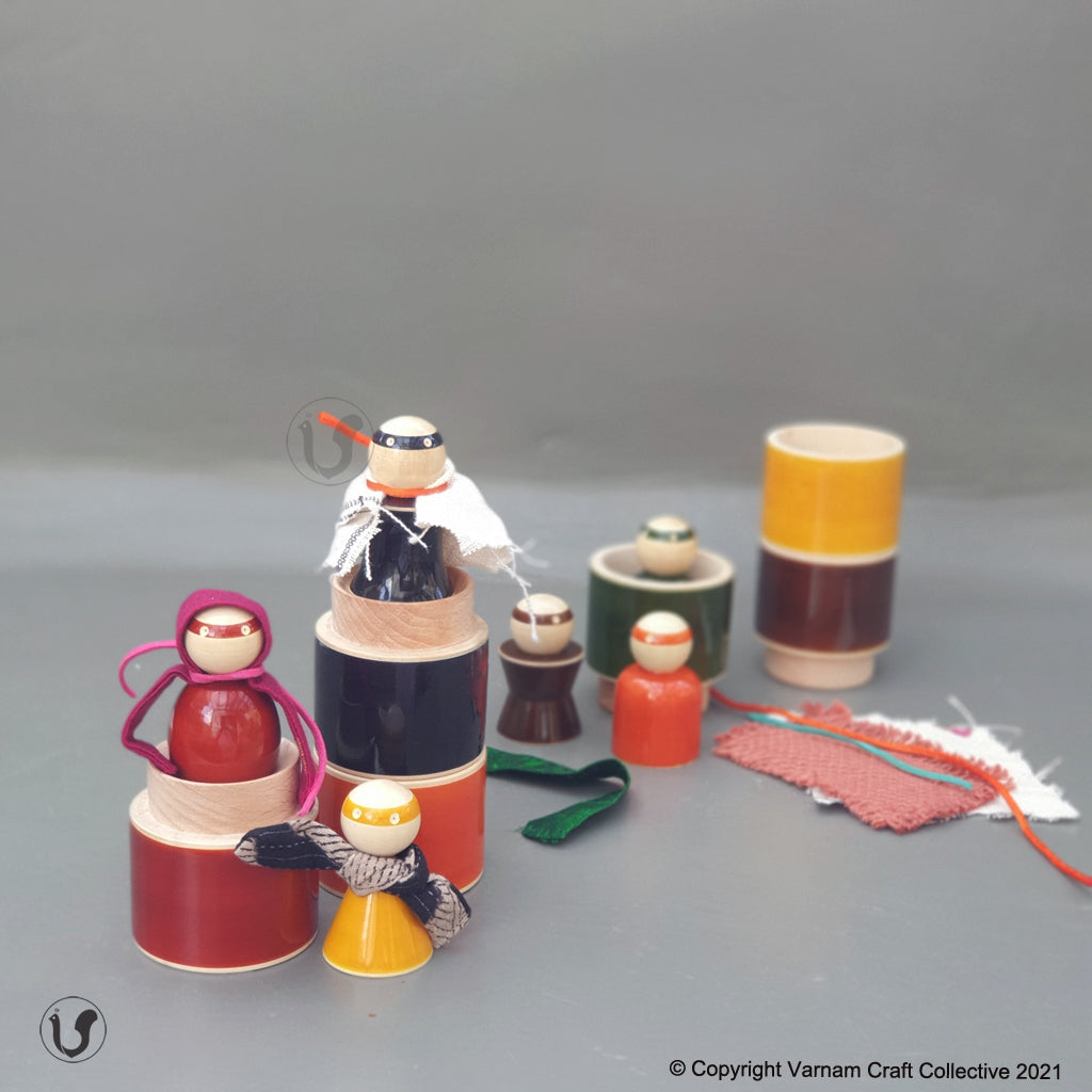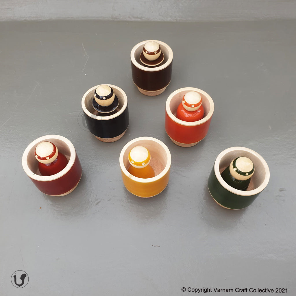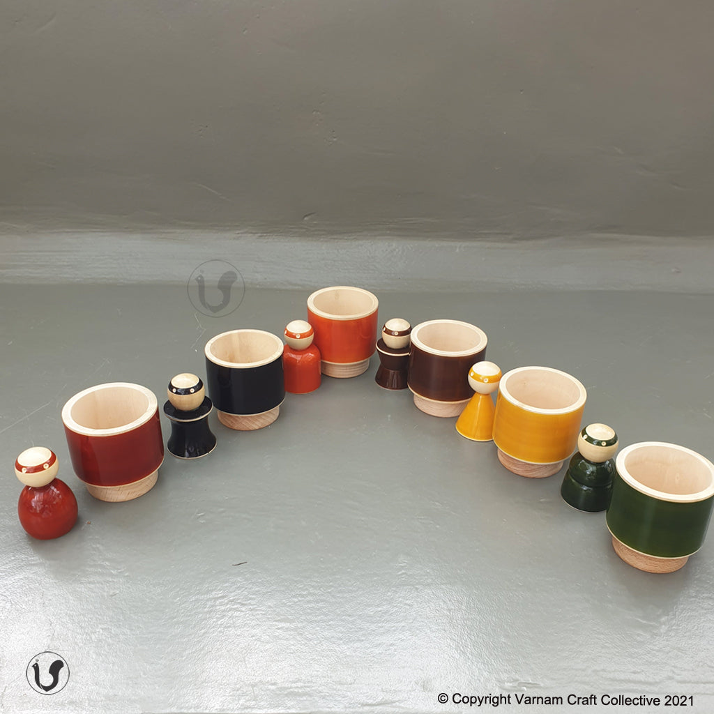 - 6 colourful wooden peg dolls and matching cups.