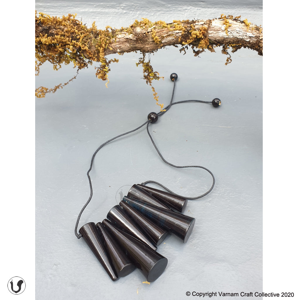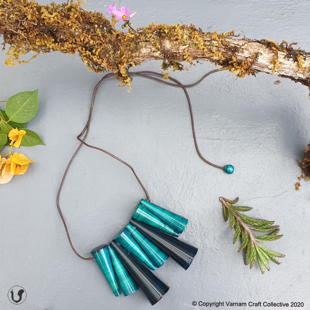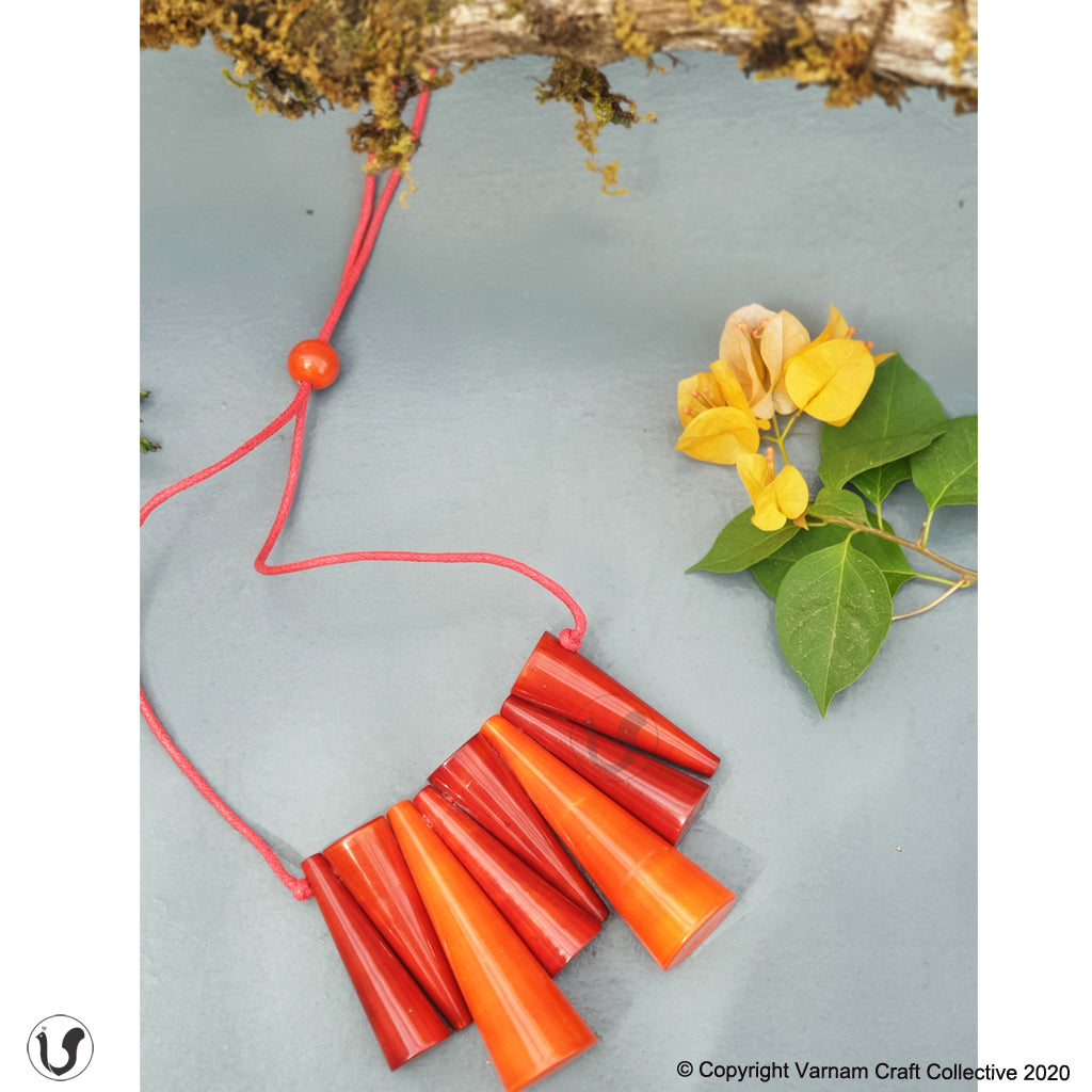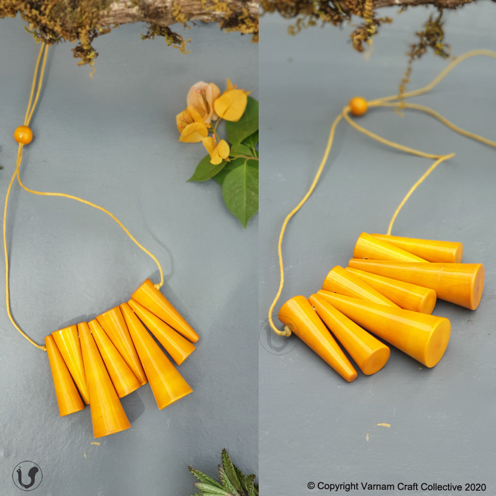 A unique one-of-a-kind style statement from the 'INBAM" series of wooden jewelry by Varnam. This piece has been handcrafted by artisans from Channapatna using the 200 year old toy craft of lac turnery. This is an eco-friendly craft. The colours used are natural dyes and non-toxic. The wood used , 'wrightia tinctoira' or ‘aale-maraa’ is extremely safe. Known for its medicinal properties, the wood is extremely lightweight. Please note that the colour may vary a bit from the one in the pic.