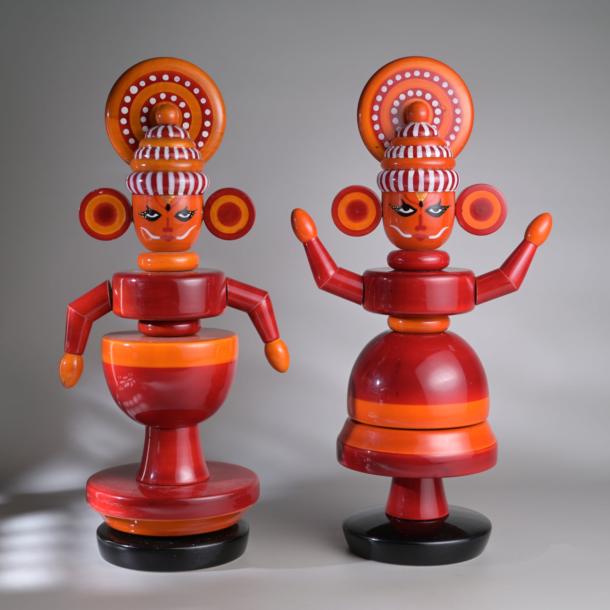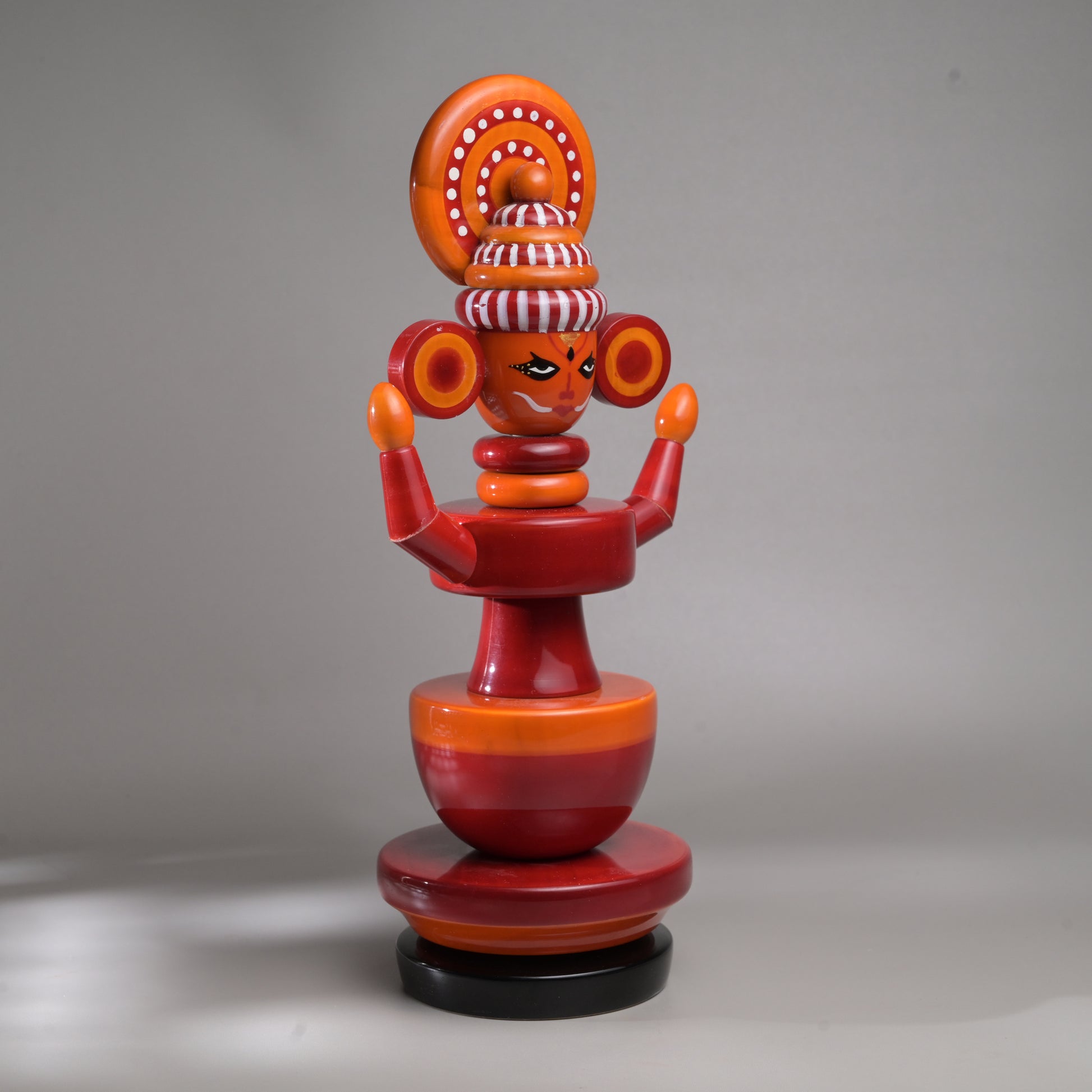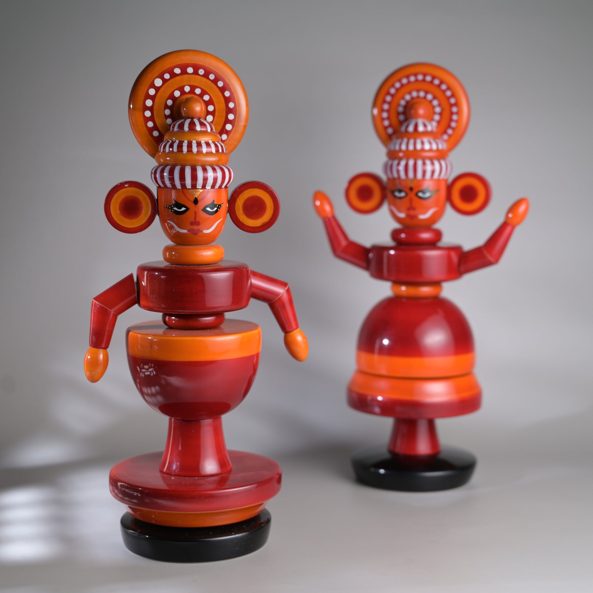 It typically takes several hours to get a Theyyam artist to get ready for a play. These dolls are no different. The wood is first turned on a lathe and then applied the base glossy colour using the traditional lac-turnery technique. And then the body and face are painted with oil paints. Please note that the price indicated is for a single unit only.