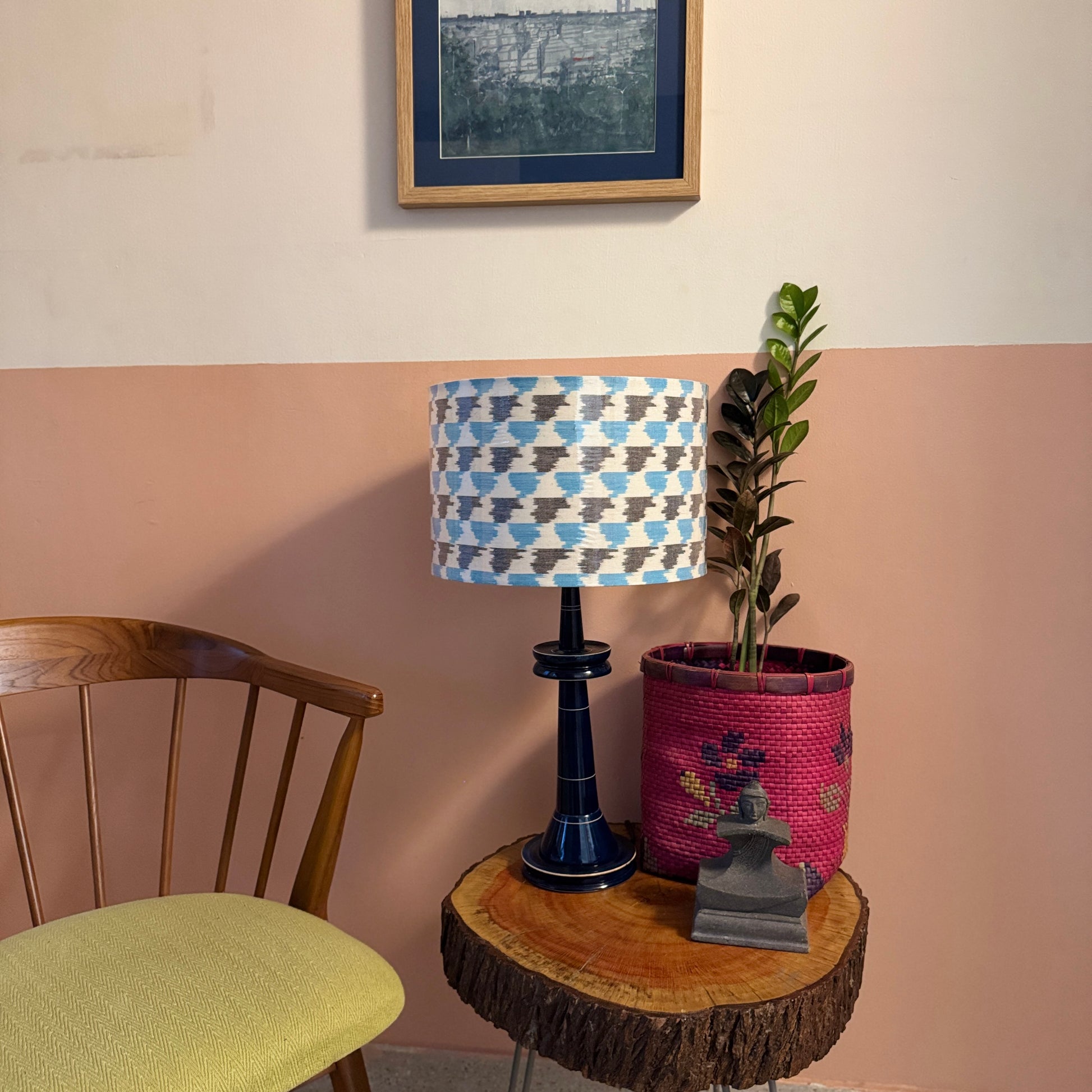 The cylindrical shade is made of premium handwoven ikat from the Koyyalagudem village in Andhra Pradesh. The wooden base is a classic design, made of Wrightia tinctoria, a medicinal plant and handturned in Channapatna, Karnataka. This product is thus a fusion of two beautiful crafts from South India.