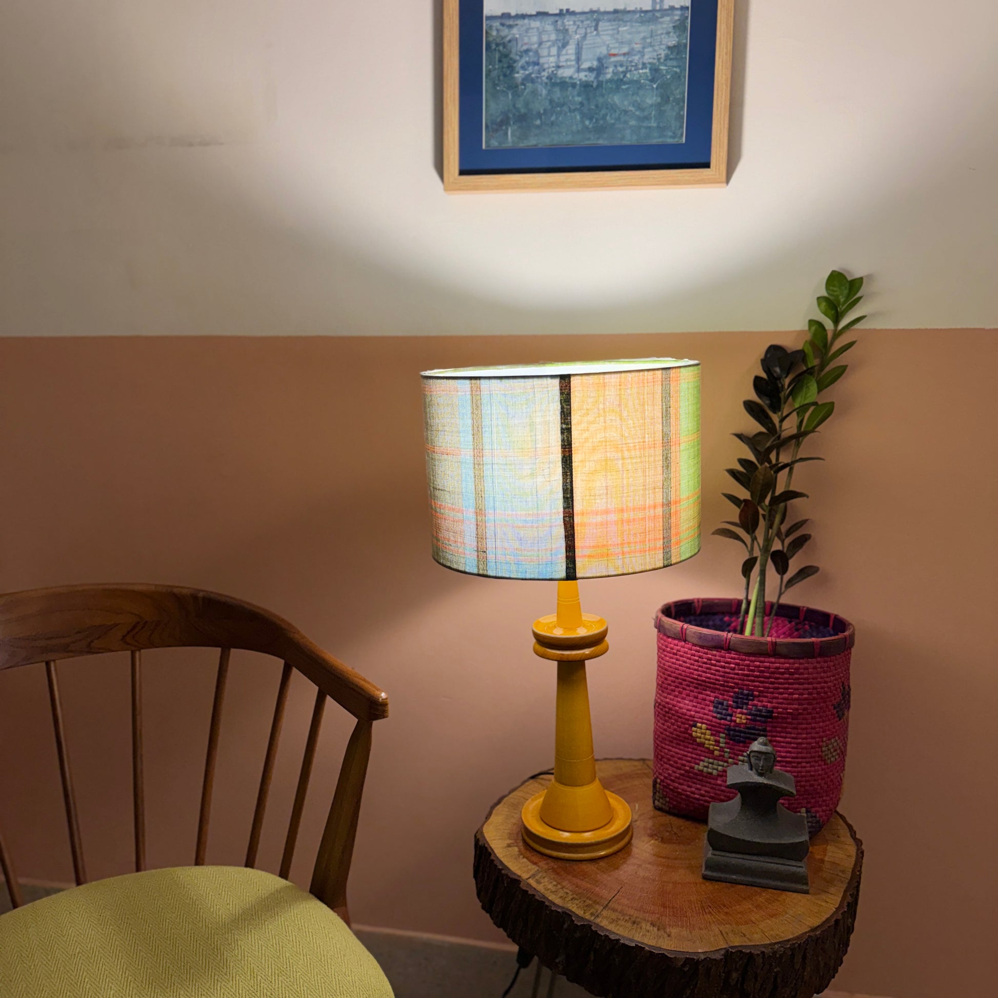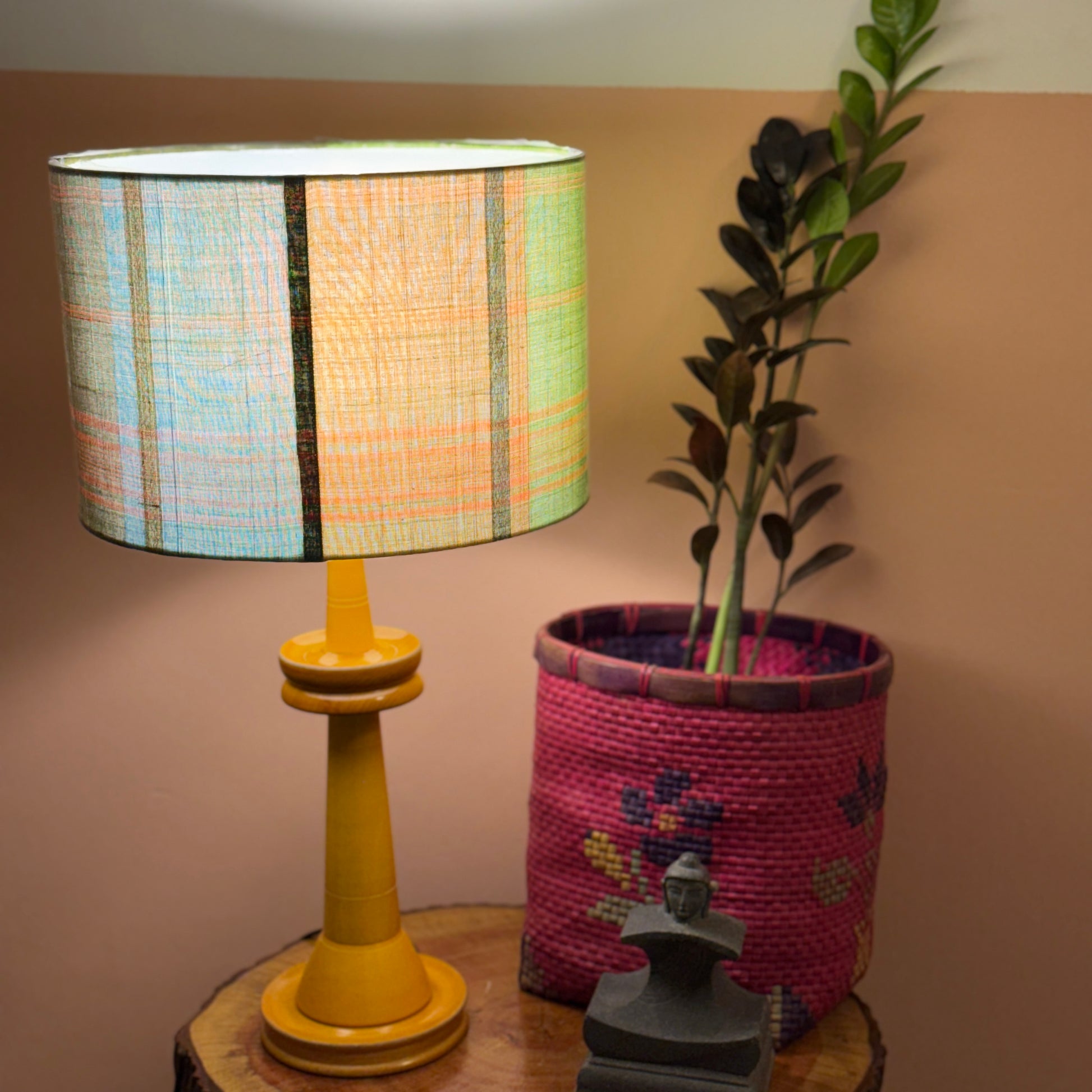 The cylindrical shade is made of premium handloom fabric from Chettinad, Tamil Nadu. The wooden base is a classic design, made of Wrightia tinctoria, a medicinal plant and handturned in Channapatna, Karnataka. This product is thus a fusion of two beautiful crafts from South India.