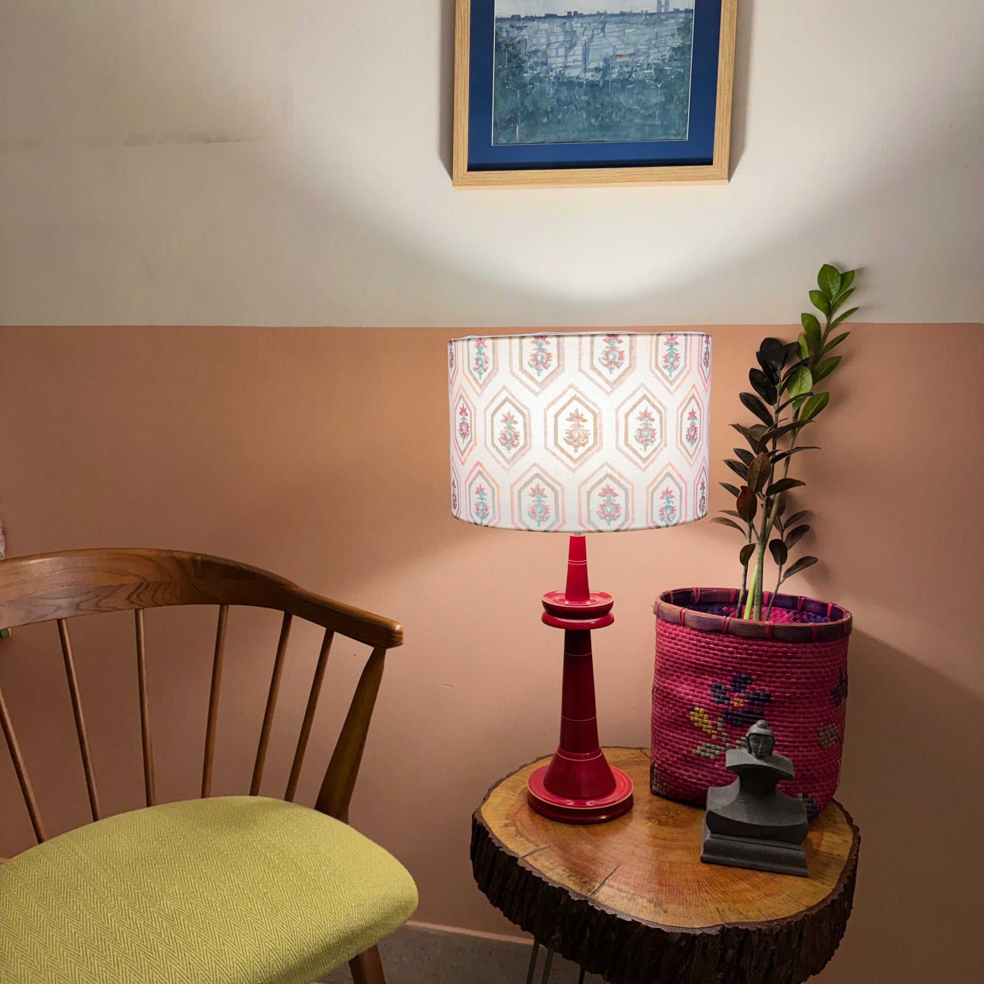 The cylindrical shade is made of premium handblock printed fabric from Sanganer, Jaipur. The wooden base is a classic design, made of Wrightia tinctoria, a medicinal plant and handturned in Channapatna, Karnataka. This product is thus a fusion of two beautiful crafts from South India.