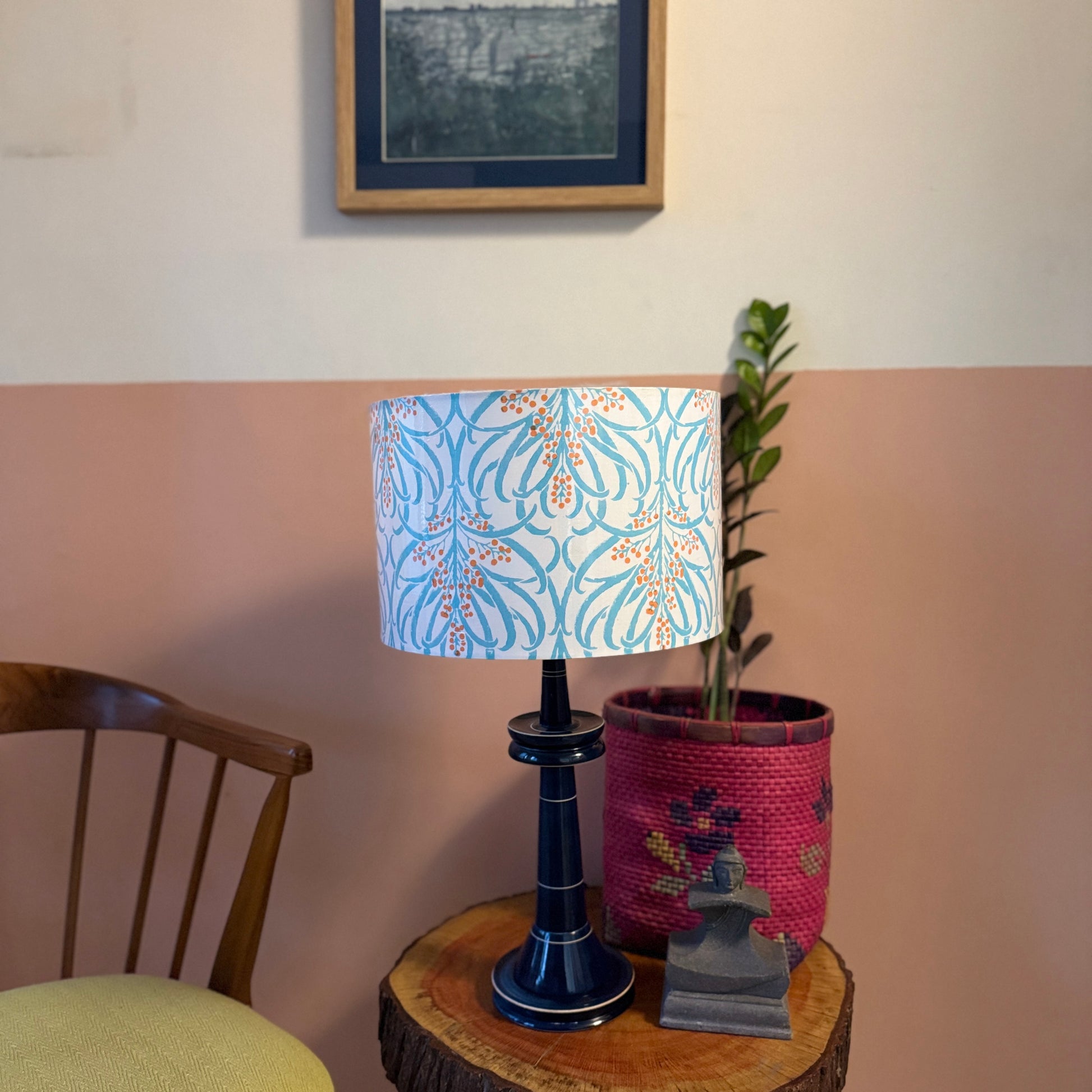 The cylindrical shade is made of premium handblock printed fabric from Sanganer, Jaipur. The wooden base is a classic design, made of Wrightia tinctoria, a medicinal plant and handturned in Channapatna, Karnataka. This product is thus a fusion of two beautiful crafts from South India.