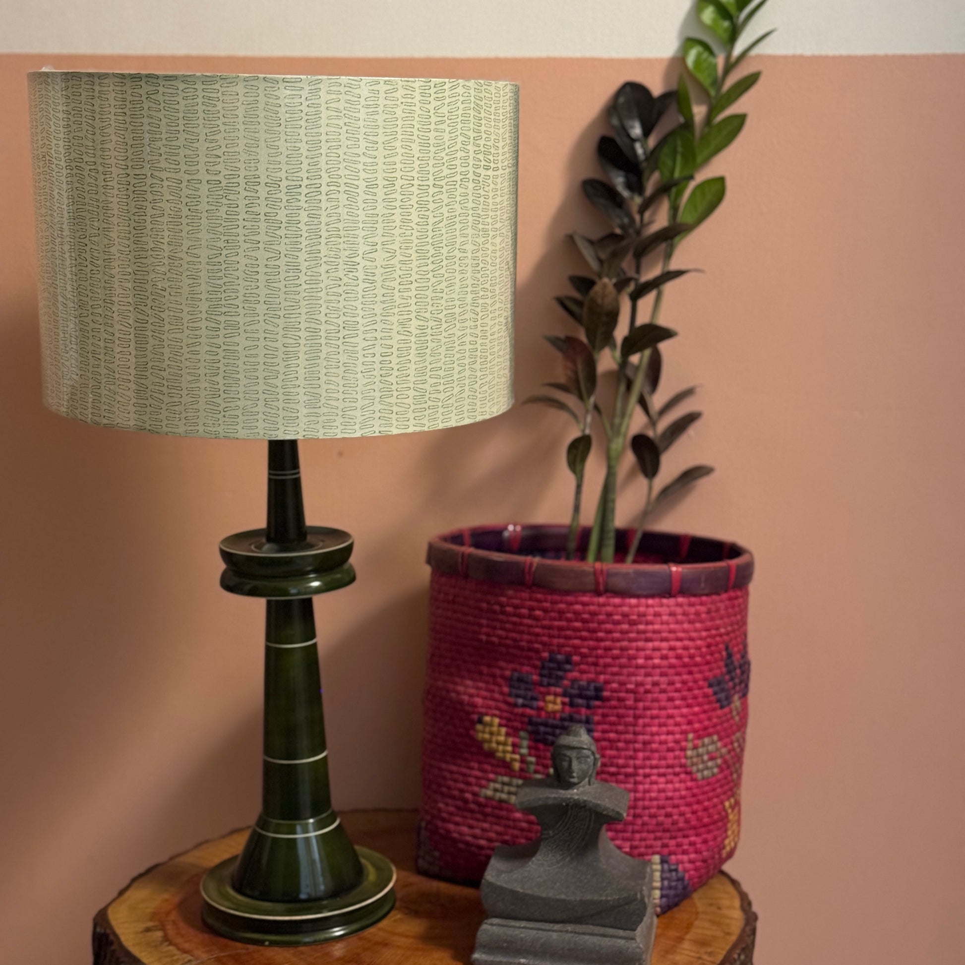 The cylindrical shade is made of premium handblock printed fabric from Sanganer, Jaipur. The wooden base is a classic design, made of Wrightia tinctoria, a medicinal plant and handturned in Channapatna, Karnataka. This product is thus a fusion of two beautiful crafts from South India.
