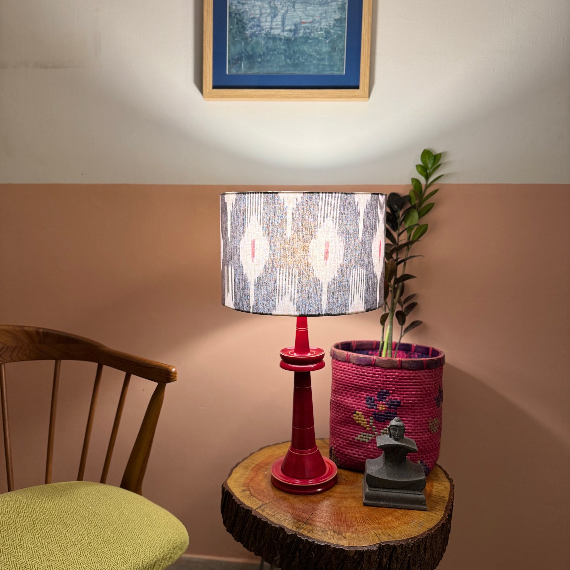 The cylindrical shade is made of premium handwoven ikat from the Koyyalagudem village in Andhra Pradesh. The wooden base is a classic design, made of Wrightia tinctoria, a medicinal plant and handturned in Channapatna, Karnataka. This product is thus a fusion of two beautiful crafts from South India.