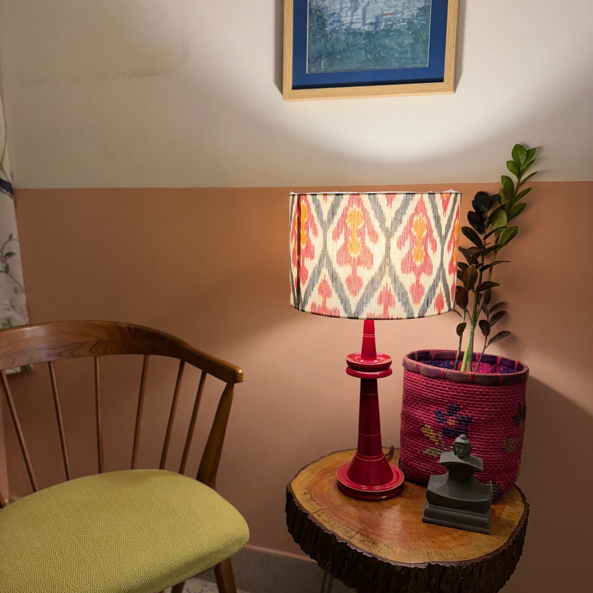 The cylindrical shade is made of premium handwoven ikat from the Koyyalagudem village in Andhra Pradesh. The wooden base is a classic design, made of Wrightia tinctoria, a medicinal plant and handturned in Channapatna, Karnataka. This product is thus a fusion of two beautiful crafts from South India.