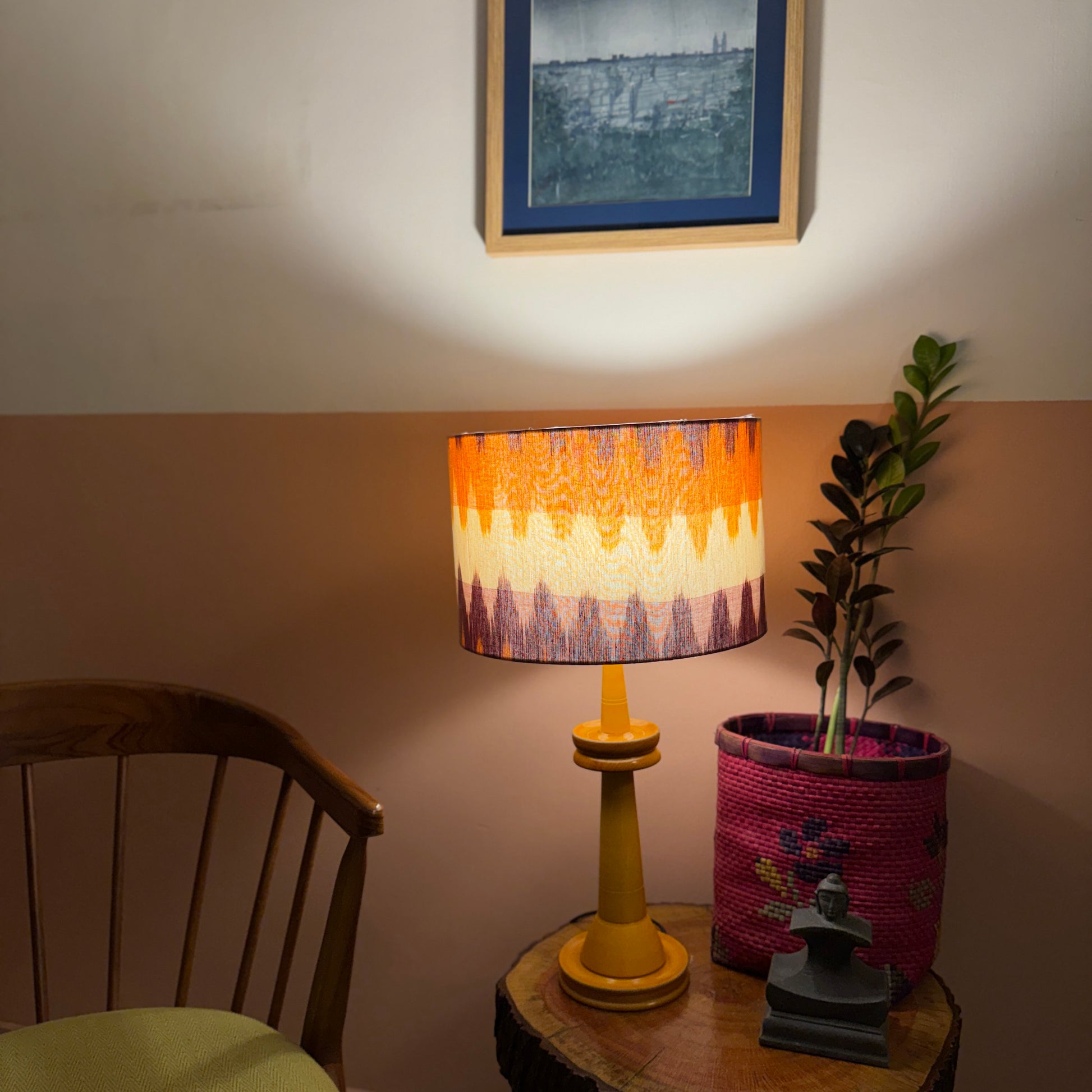 The cylindrical shade is made of premium handwoven ikat from the Koyyalagudem village in Andhra Pradesh. The wooden base is a classic design, made of Wrightia tinctoria, a medicinal plant and handturned in Channapatna, Karnataka. This product is thus a fusion of two beautiful crafts from South India.