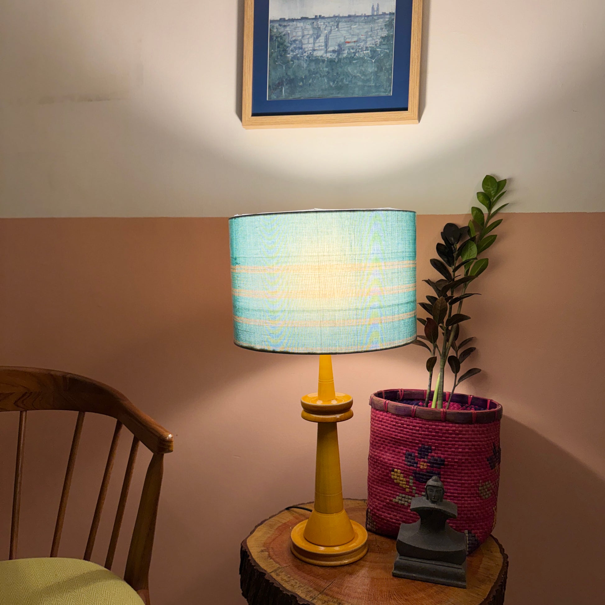 The cylindrical shade is made of premium handloom fabric from Chettinad, Tamil Nadu. The wooden base is a classic design, made of Wrightia tinctoria, a medicinal plant and handturned in Channapatna, Karnataka. This product is thus a fusion of two beautiful crafts from South India.