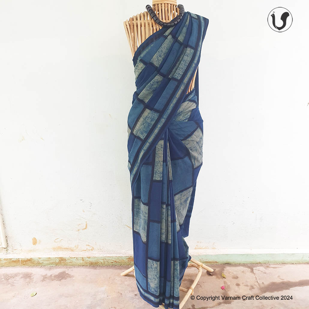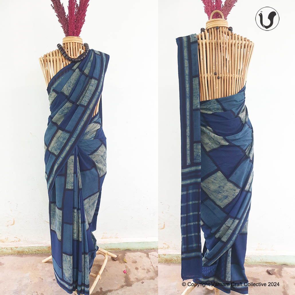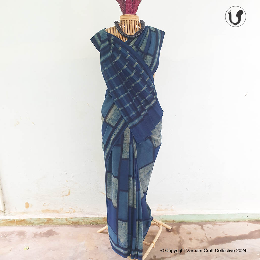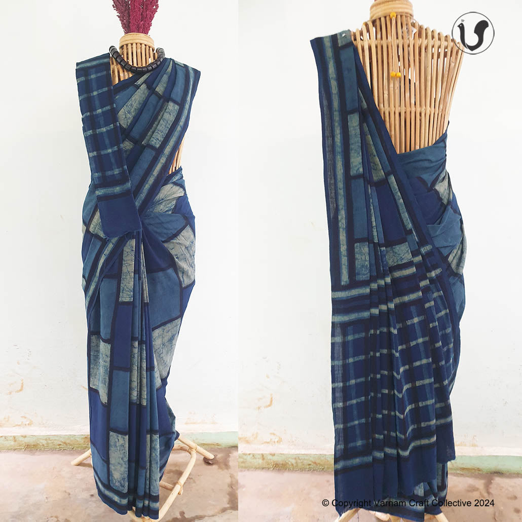 This cotton slub saree is a contemporary take on the traditional hand block printing craft of Dabu, Rasjathan. These handblock prints have been custom made using natural dyes
