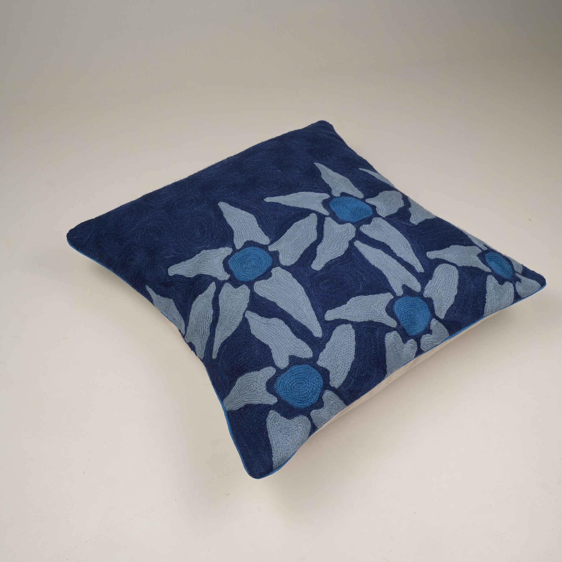 Crewel embroidery in Kashmir has been practised for over 400 years, often decorating royal garments and home furnishings . Unlike most embroidery crewel work uses fine wool threads embroidered onto cotton canvas called 'Dusooti' . The motifs often depict Kashmir's gardens : chinar leaves, tulips, vines and cypress trees. Artisans traditionally use an 'aari' hook (a fine crochet-like tool) instead of a regular needle, for speed and fluid curves. Crewel isn't just pretty, it's durable. That's why it is often used in rugs, curtains and upholstery.